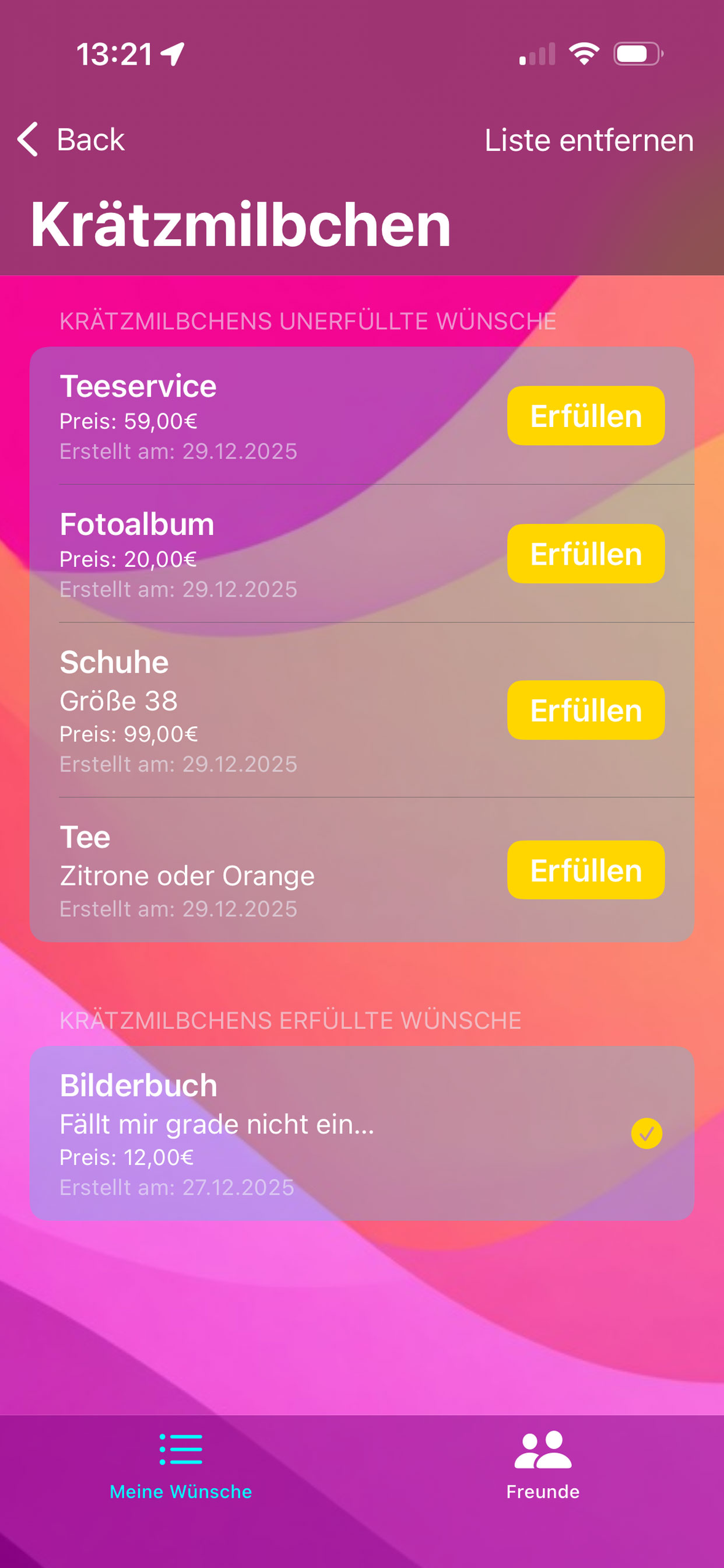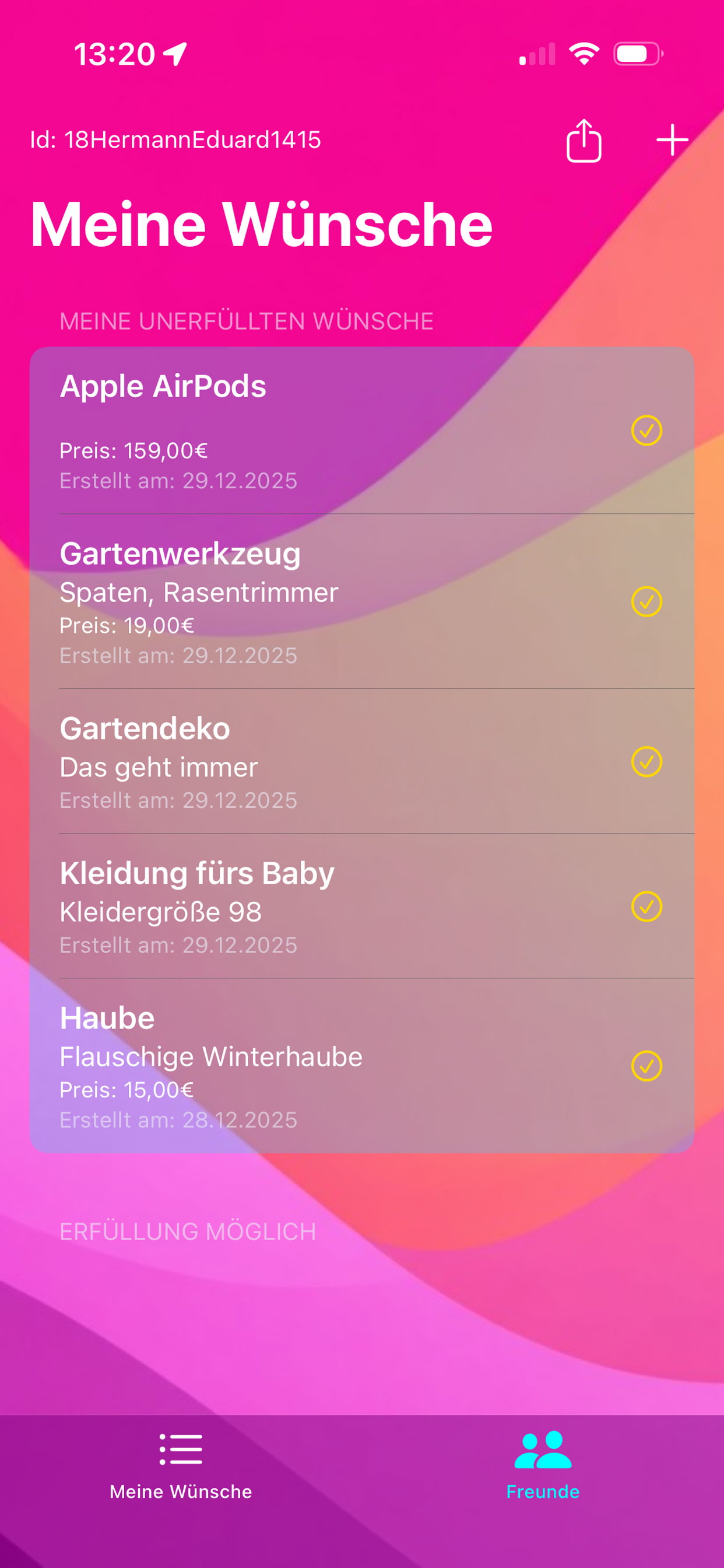 Teile deine Wünsche per Link mit Familie und Freunden. Sie können sehen, was du dir wünschst und Wünsche als erfüllt markieren.